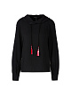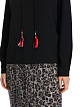 Черная толстовка выполнена из натурального хлопка с добавлением хлопка. Дополнена воротником с завязками с цветными кисточками, леопардовой вставкой и длинными рукавами. Такая толстовка прекрасно подходит для повседневных и спортивных образов.