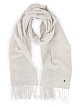 Бежевый шарф выполнен на основе натуральной шерсти с добавлением кашемира. Украшен фирменным логотипом и изящной бахромой по краям. Теплый и элегантный шарф.