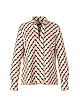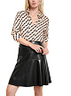 Дизайн блузы свободного кроя и немного расклещенного силуэта дополнен оригинальной складкой спереди. Модель блузы украшает ярким графическим принтом,и благородно дополняется V-образным вырезом с воротником круглыми и декоративными пуговицами на манжетах, которые можно расстегнуть и отвернуть.