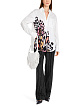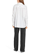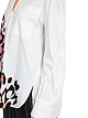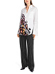 Белая блуза свободного кроя выполнена из натурального хлопка с добавлением эластана. Дополнена отложным воротником с V-образным вырезом, широкими манжетами и накладным карманом, а также закругленными разрезами по бокам и удлиненной задней частью. Украшена ярким принтом и декоративными швами на рукавах. Элегантная блуза для женственных образов с юбками и брюками.