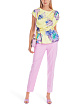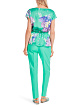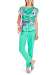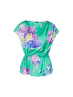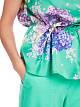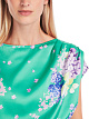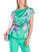 Зеленая свободная блуза, выполненная из струящейся переработанной ткани и украшенная цветочным принтом. Дополнена округлым вырезом, короткими рукавами, асимметричной драпировкой и кулиской на талии. Эффектная блуза прекрасно сочетается с брюками в тон.