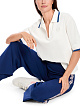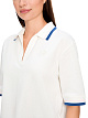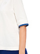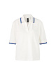 Белая блузка свободного кроя выполнена из натурального хлопка. Дополнена отложным воротником с V-образным вырезом, рукавами средней длины, контрастной отделкой в полоску и логотипом на груди. Стильная блузка на каждый день.