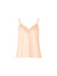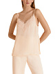 Элегантный однотонный топ свободного прямого кроя выполнен в бельевом стиле. Украшен изысканным кружевом и дополнен V-образным вырезом и тонкими регулируемыми бретелями.