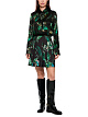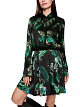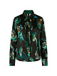 Зеленая свободная блуза выполнена из натурального шелка с добавлением эластана. Украшена красочным принтом с перьями. Дополнена отложным воротником, длинными рукавами с манжетами и планкой на пуговицах. Эффектная блуза для деловых образов.