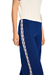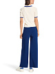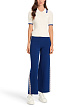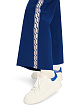 Синие широкие брюки выполнены из мягкой ткани на основе вискозы. Дополнены эластичным поясом и жаккардовыми контрастными лентами по бокам брючин. Отлично впишутся в повседневные и спортивные образы.