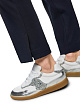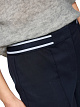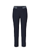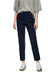Темно-синие зауженные брюки выполнены на основе органического хлопка с добавлением эластана. Дополнены эластичным поясом в полоску и прошитыми стрелками на брючинах. Идеально подходят для деловых и повседневных образов.
