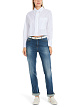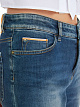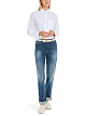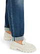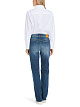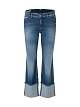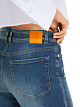 Синие джинсы выполнены из натурального хлопка с добавлением эластана. Дополнены шлевками для ремня, карманами, легкими потертостями и стильными подворотами на брючинах. Такие джинсы отлично впишутся в ваш базовый гардероб.