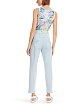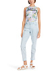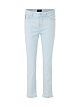 Голубые укороченные джинсы облегающего кроя выполнены из натурального хлопка с добавлением эластана. Дополнены шлевками для ремня, передними карманами, задними карманами с бахромой и фирменной нашивкой на поясе. Стильные джинсы для весенне-летних образов.