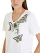 Футболка с вышитым принтом в виде бабочек и буквами логотипа. Футболка изготовлена из ткани Supreme Green Cotton® и отмечена знаком проекта «Rethink Together» (производство с особенно бережым отношением к окружающей среде). Хлопок высокого качества, изготовленный по технологии SGC, которое предполагает полный контроль изготовления материала, начиная от хлопкового поля до прядильной фабрики. Хлопок, не содержащий ГМО, изначально поступает из Греции, где фермеры, выращивающие хлопок, используют эффективное капельное орошение, экономящее воду.
