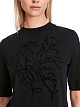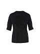 Футболка выполнена из натурального хлопка. Украшена цветочным принтом в тон со стразами. Дополнена округлым вырезом с узким воротником и рукавами средней длины. Стильная базовая футболка.