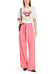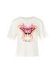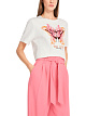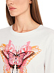Белая футболка свободного кроя выполнена из натурального хлопка. Дополнена округлым вырезом и короткими рукавами. Яркая аппликация на груди в форме бабочки украшена бисером, перьями и пайетками. Отличная базовая футболка для повседневных женственных образов.
