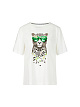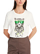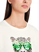 Белая футболка свободного кроя выполнена из натурального хлопка. Дополнена округлым вырезом и короткими рукавами. Принт с леопардом на груди украшен пайетками, бисером и бахромой. Стильная базовая футболка для повседневных образов с джинсами или брюками.