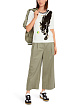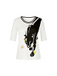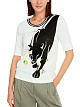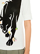 Белая футболка в рубчик облегающего кроя выполнена из натурального хлопка с добавлением эластана. Дополнена округлым вырезом и рукавами средней длины. Украшена принтом с пантерой и яркими аппликациями. Такая футболка легко впишется в повседневные образы с юбками и брюками.