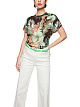 Зеленая футболка прямого кроя выполнена из натурального хлопка с добавлением эластана. Украшена сплошным цветочным принтом. Дополнена округлым вырезом, короткими рукавами и отделкой в рубчик с контрастными полосками. Стильная футболка на каждый день.