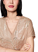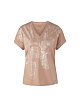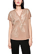 Светло-коричневая футболка свободного кроя выполнена из органического хлопка. Украшена нежным цветочным принтом с мерцающими деталями из фольги. Дополнена V-образным вырезом и короткими рукавами. Легкая и удобная футболка идеально подходит для создания женственных повседневных образов.