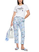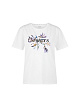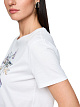 Белая футболка прямого кроя выполнена из натурального хлопка. Украшена изящным цветочным принтом с надписью и пайетками для легкого мерцания. Стильная футболка для образов с акцентом.
