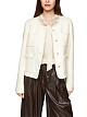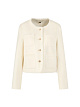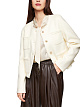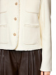Укороченный жакет молочного оттенка выполнен из натуральной шерсти. Дополнен округлым вырезом, четырьмя накладными карманами, декоративной бахромой и изысканными мерцающими пуговицами. Идеальный вариант для элегантных женственных образов.