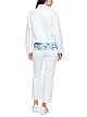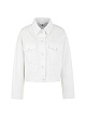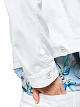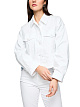 Короткая белая джинсовая куртка выполнена из хлопка с добавлением эластана. Украшена вышивкой и сверкающими пайетками на плечах. Дополнена отложным воротником, застежкой на пуговицы и двумя карманами с клапанами. Элемент летнего гардероба, выполненный в классическом белом цвете. Джинсовая классика и современный минимализм.