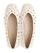 Изящные балетки молочного оттенка выполнены из натуральной кожи с резиновой подошвой без каблука. Мягкая кожаная подкладка и округлый носок обеспечивают максимальный комфорт, а декоративные заклепки придают балеткам стильный вид. Универсальны и отлично сочетаются с джинсами, юбками или платьями.