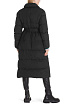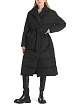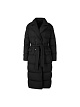 Черное стеганое пальто свободного кроя выполнено с утеплителем из 90% пуха и 10% пера. Дополнено воротником с лацканами, двубортной застежкой на кнопки, съемным поясом для идеальной посадки и двумя практичными карманами по бокам. Отличное базовое теплое пальто на осенне-зимний сезон.