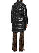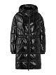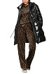 Черное стеганое пальто выполнено из экологичного материала с блеском и наполнителем из искусственного пуха. Дополнено воротником-стойкой и регулируемым капюшоном, боковыми карманами, леопардовой нашивкой с логотипом на рукаве и кулиской на талии. Теплое и стильное пальто на холодную погоду.