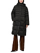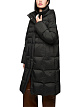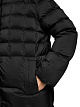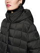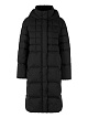 Черное стеганое пальто выполнено из прочной ткани с наполнителем из натурального пуха и перьев. Дополнено воротником-стойкой с капюшоном, карманами и потайной молнией с планкой. Теплое базовое пальто для холодного времени года.