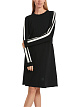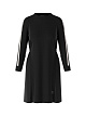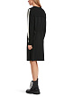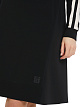 Черное платье свободного кроя выполнено в спортивном стиле на основе вискозы. Дополнено контрастными полосками по длинными рукавам с манжетами, округлым вырезом и эластичным шнурком на задней части для создания приталенного силуэта. Такое платье будет отлично смотреться с кроссовками или кедами.