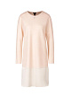 Платье прямого силуэта из высококачественной шерсти. Платье украшено по низу атласной тканью, оригинально обыгрывая контраст матового и глянцевого материалов.
