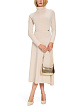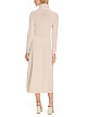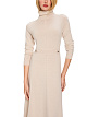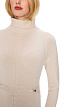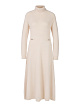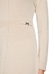 Вязаное платье выполнено из натуральной шерсти. Дополнено воротником-стойкой, расклешенной юбкой, длинными рукавами и золотистыми декоративными элементами на талии. Элегантное платье для женственных образов.