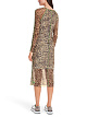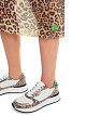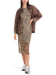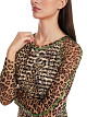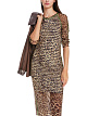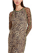Платье длины миди с леопардовым принтом выполнено из эластичной полупрозрачной ткани. Дополнено округлым вырезом, длинными рукавами реглан и трикотажной подкладкой в полоску. Контрастные оверлочные швы придают стильный акцент. Прекрасный вариант для дерзких женственных образов.