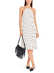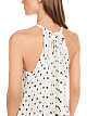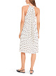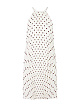 Белое плиссированное платье А-силуэта выполнено из легкой струящейся ткани. Дополнено округлым вырезом и принтом в горошек. Украшено элегантным бантом и драпировкой сзади. Идеальный вариант для женственных летних образов.