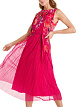 Элегантное плиссированное платье без рукавов с широким вырезом. Платье выполнено из тонкого эластичного блестящего трикотажа и украшено ярким принтом в виде тюльпанов. Талию можно женственно подчеркнуть поясом с завязками. На спинке изделия тонкая молния