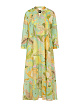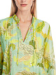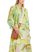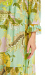 Зеленое многослойное платье выполнено из полупрозрачного сочетания натурального хлопка и шелка. Украшено сплошным цветочным принтом. Дополнено узким воротником на завязках, небольшим V-образным вырезом, плиссированными деталями, длинными рукавами с оборками. Воздушное платье для эффектных женственных образов.
