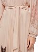 Женственное бежевое платье миди выполнено из струящейся ткани с изысканной плиссировкой. Украшено уточенным цветочным узором, который добавляет романтики в образ. Дополнено узким воротником-стойкой на пуговице, длинными рукавами реглан с манжетами с оборками и поясом в тон на талии. Идеально подходит для нежных аутфитов