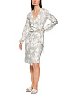 Элегантное серое платье выполнено из высококачественной вискозы с легким мерцанием металлизированного волокна. Рукава-фонарики придают объем, а силуэт на запах подчеркивает талию. Нежный цветочный узор придает платью мягкость. Прекрасно подходит как для элегантных, так и для повседневных образов.