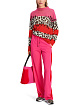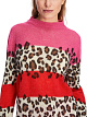 Яркий пуловер в красно-розовую полоску выполнен на основе сочетания натуральной шерсти и шерсти альпака. Украшен леопардовым принтом. Дополнен округлым вырезом и длинными рукавами. Такой пуловер станет красочным акцентом в любом образе.