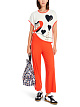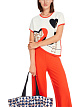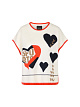 Белый вязаный пуловер свободного кроя выполнен на основе натурального хлопка. Дополнен округлым вырезом, короткими рукавами и контрастной отделкой в рубчик. Украшен ярким узором в виде сердец. Такая стильная модель отлично впишется в расслабленный образ с брюками в спортивном стиле и джинсами.