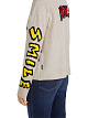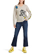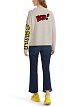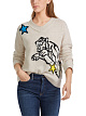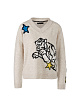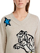 Бежевый пуловер выполнен на основе натуральной шерсти с добавлением кашемира. Такой материал отлично удерживает тепло. Пуловер дополнен фактурным V-образным вырезом и яркими принтами в стиле комиксов.