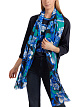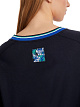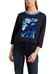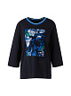 Темно-синяя футболка свободного кроя выполнена на основе натурального хлопка. Дополнена округлым вырезом с контрастной окантовкой и рукавами 3/4. Яркий принт в цветочных мотивах создает стильный акцент.