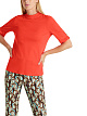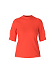 Красная футболка выполнена из эластичной ткани на основе натурального хлопка. Дополнена округлым вырезом, рукавами три четверти с декоративными пуговицами и лаконичным логотипом Marc Cain на подоле. Идеальная базовая футболка для вашего гардероба, которую можно сочетать и со строгими брюками, и с джинсами.
