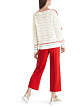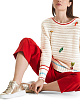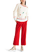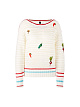 Легкий воздушный пуловер свободного кроя выполнен из высококачественного сочетания шерсти и кашемира. Украшен фактурным рисунком с вышитыми аппликациями овощей и бисером. Цветные полоски на манжетах и по округлому вырезу подчеркивают современный образ.