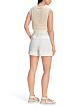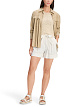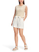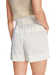Белые широкие шорты выполнены из сочетания натурального льна и вискозы с добавлением эластана. Дополнены поясом в тон, карманами, защипами на брючинах и подворотами. Яркие шорты для элегантных летних образов.