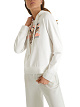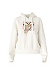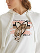 Белое худи свободного кроя с ярким принтом изготовлено из удобной эластичной ткани на основе хлопка. Украшено принтом с леопардом, узором из бисера, пайеток и коротких нитей и мотивирующей надписью и дополнено капюшоном на завязках.
