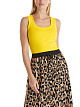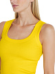 Желтый топ облегающего кроя выполнен из эластичного трикотажа джерси в рубчик на основе натурального хлопка. Дополнен широкой окантовкой по округлому глубокому вырезу и проймам. Отличный базовый топ лаконичного кроя на каждый день.