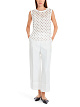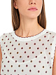 Белый топ выполнен из эластичной ткани на основе натурального хлопка. Дополнен округлым вырезом и подкладкой. Украшен принтом в горошек и декоративной отделкой. Такой элегантный топ отлично подойдет и для офиса, и для отдыха.
