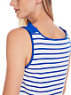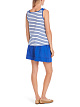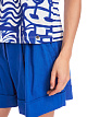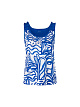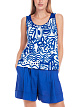 Синий облегающий топ выполнен из натурального хлопка с добавлением эластана. Украшен контрастным принтом спереди и бело-синей полоской сзади. Допонлен округым вырезом и широкими бретелями с изящными рюшами. Эффектный топ для стильных летних образов.