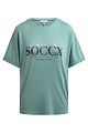 Футболка с логотипом SOCCX из модала создаёт великолепный образ. Специальный материал делает её гладкой и струящейся, а свободный крой обеспечивает комфорт. Рисунок украшен декоративными камнями, а так же имеет спущенные плечи и отворот.